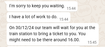Taka sytuacja przytrafiła nam się gdy chcieliśmy 30.12 przejechać z Luang Prabang do Vang Vieng. Ostatecznie byliśmy zmuszeni kupić je przez stronę 12go.asia od pośrednika RG Adventure. Proces pozakupowy był kompletnie nieintuicyjny, gdyż zamiast biletu otrzymaliśmy kontakt na Whatsapp do przedstawiciela tej firmy. Po skontaktowaniu się i podaniu numeru rezerwacji z 12go dostaliśmy… zdjęcia 2 Tajów, których mieliśmy szukać przed stacją kolejową, żeby odebrać od nich bilety przebukowane na nasze nazwiska.