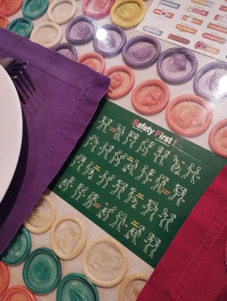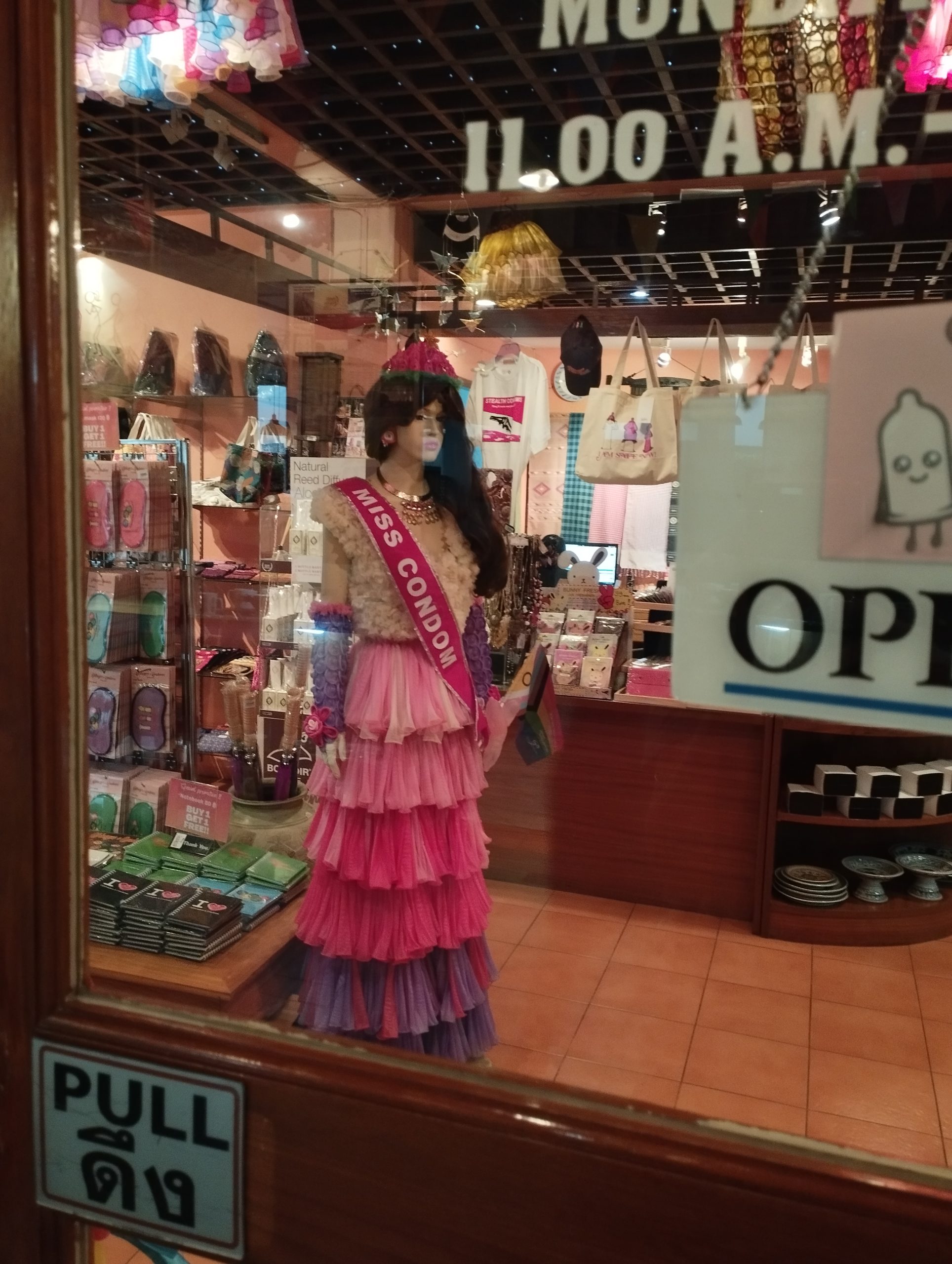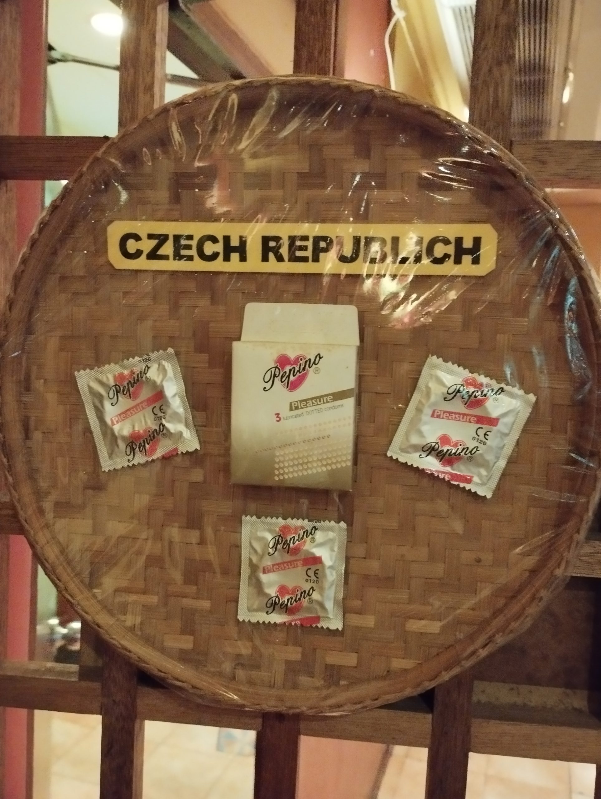 Przed restauracją wita nas dyskretny kondom wsunięty pod menu. Potem robi się tylko ciekawiej. Naprzeciwko sklepu z firmowymi gadżetami stoją cztery fotostandy w kształcie kondomów z otworami na twarz, umożliwiające zrobienie sobie pamiątkowego zdjęcia jako „rodzina kondomów”. Przez witrynę sklepu można dostrzec manekina ubranego w sukienkę z kondomów, przepasaną szarfą z napisem “Miss Condom”. Stoły również są wyłożone gumkami, a na ścianach można podziwiać reklamy prezerwatyw z różnych zakątków świata oraz kilka intrygujących podobizn Mechaia. Na wyjściu zamiast miętówek możemy poczęstować się oczywiście kondomem. Dostępne są cztery rozmiary: “military size”, “politician size”, “coup d’etat size” i “brand new democracy size”.