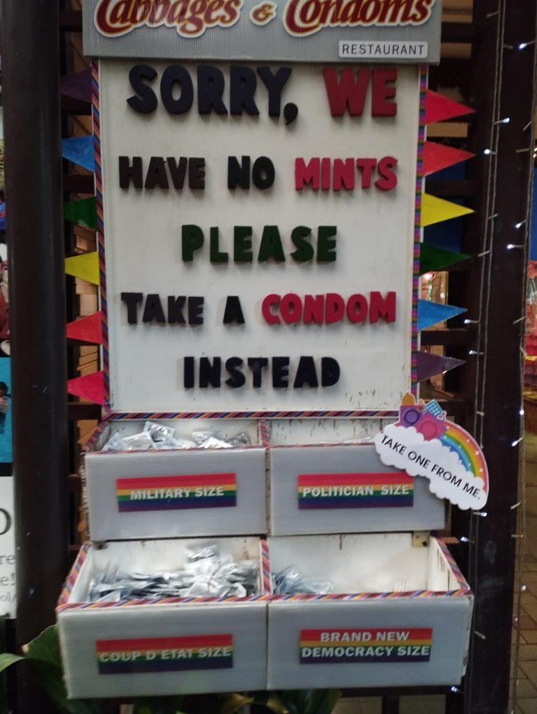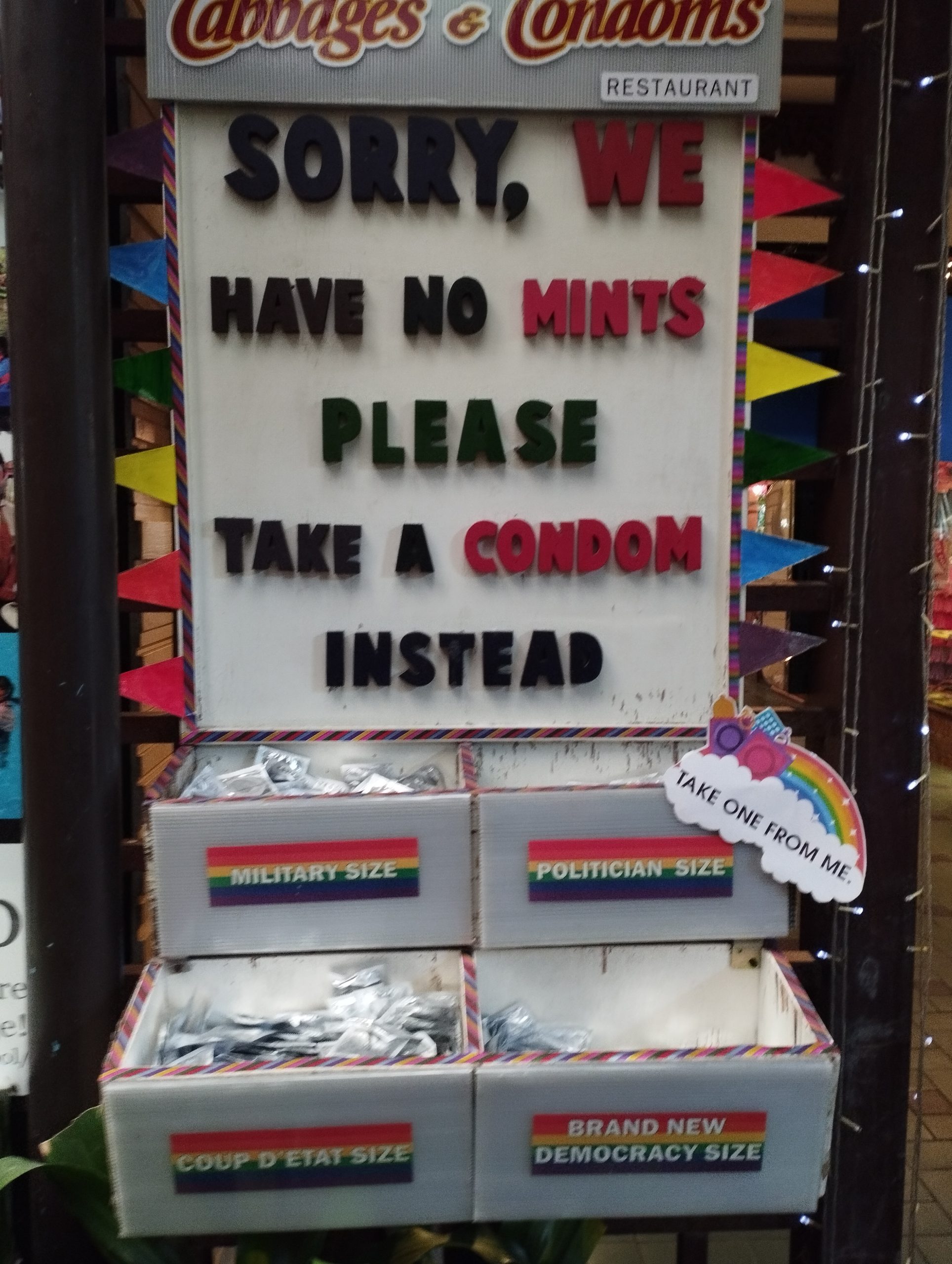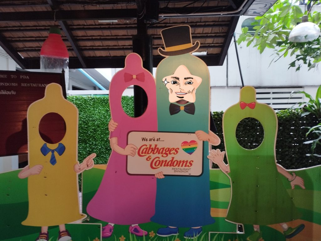 Gdzieś w Bangkoku, pomiędzy parkiem Benchakitti i Korean Town znajduje się restauracja o intrygującej i wywołującej uśmiechy przechodniów nazwie: Cabbages&Condoms. Ich jedzenie jest przeciętne jak na tajskie standardy, jednak warto odwiedzić ten lokal ze względu na jego ciekawą historię i nietuzinkowe dekoracje.