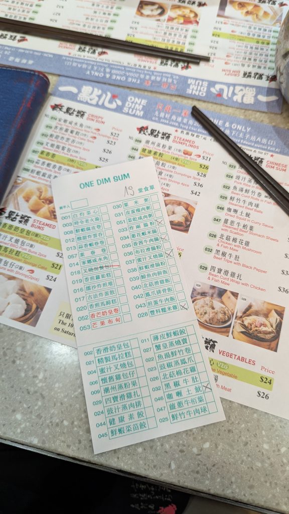 Na jednorazowym formularzu należy wpisać numer stolika oraz liczbę osób. Gdzieś na pierwszej stronie znajduje się informacja, ile kosztuje herbata dla jednej osoby. Herbata nie jest opcjonalna – nie da się z niej zrezygnować; odpowiednia kwota zostanie automatycznie doliczona do rachunku. Mając to za sobą, przechodzimy do najważniejszego, czyli głównego menu. Dania zaznacza się niczym na kuponie lotto. W niektórych restauracjach stawia się krzyżyk w kwadraciku obok obrazka, w innych – menu ze zdjęciami jest zalaminowane, a do zaznaczania służy osobna mała kartka zapisana wyłącznie po chińsku. W takich wypadkach trzeba polegać na numerach dań, chyba że zna się kantoński. Karteczkę przekazujemy obsłudze.
