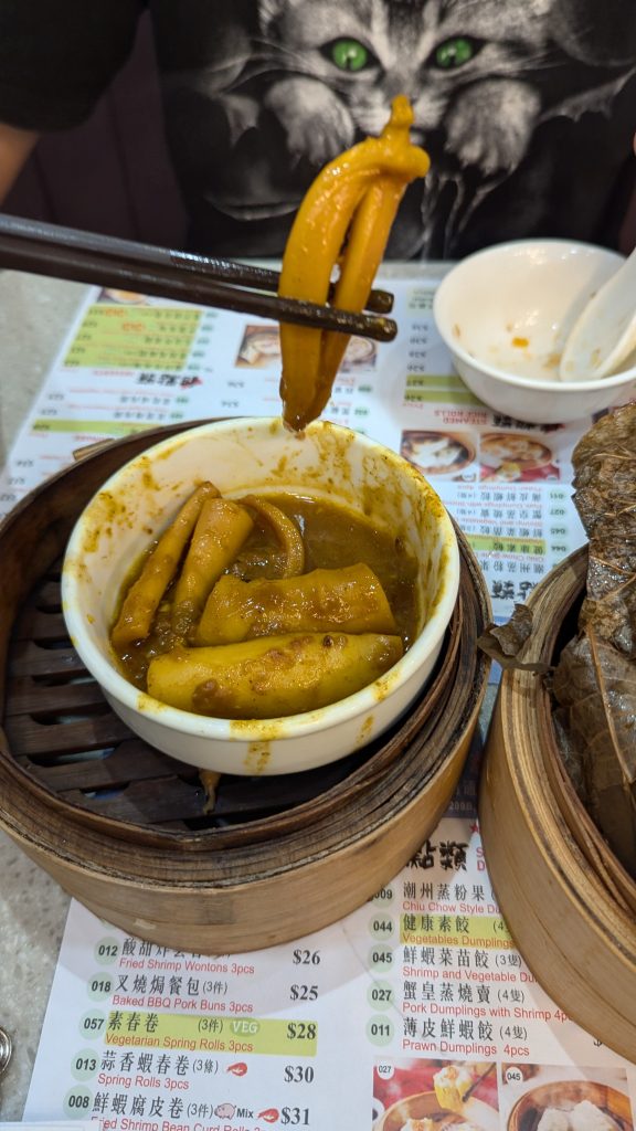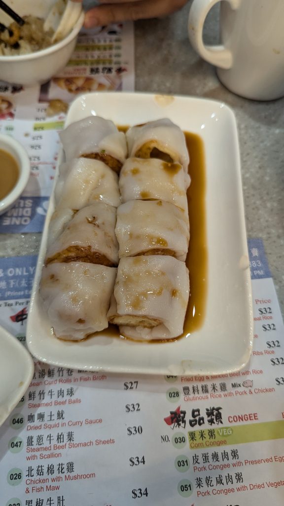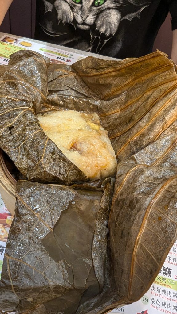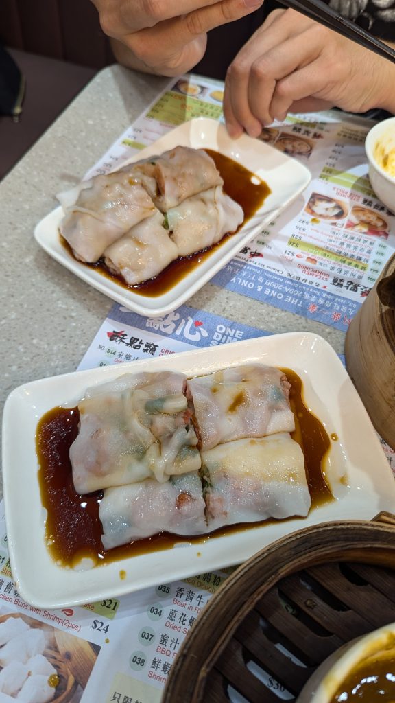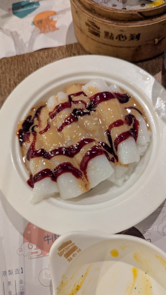 Naszym ulubionym daniem jest Cheong Fun. Nazwa nawiązuje do jelita, ale jest to po prostu rodzaj ciasta ryżowego przypominającego flaki. Podawane z samym sosem albo z nadzieniem, np. wieprzowiną char siu. Ciężko je chwycić pałeczkami. Podobnym daniem jest zhaliang, czyli ciasto w cieście: youtiao zawinięte w ciasto ryżowe. Smakuje lepiej niż brzmi i wygląda.