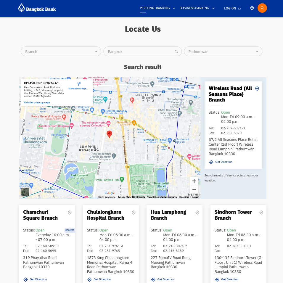Najprościej przez Google Maps. Kolejna opcja to wyszukanie oddziału bezpośrednio na stronie internetowej: https://www.bangkokbank.com/en/Locate-Us. Należy wybrać miejscowość (np. Bangkok) oraz wybrać dzielnicę (np. Chom Thong).